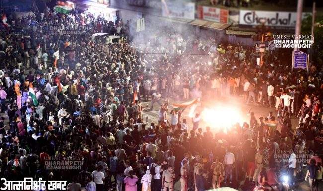 नागपुर ब्यूरो: चैंपियंस ट्रॉफी के वनडे क्रिकेट मैच में भारत की पाकिस्तान पर 6 विकेट से जीत के बाद नागपुर में जश्न का माहौल था। वेस्ट हाईकोर्ट रोड पर युवाओं का हुजूम जश्न मनाने के लिए इकट्ठा हुआ था।